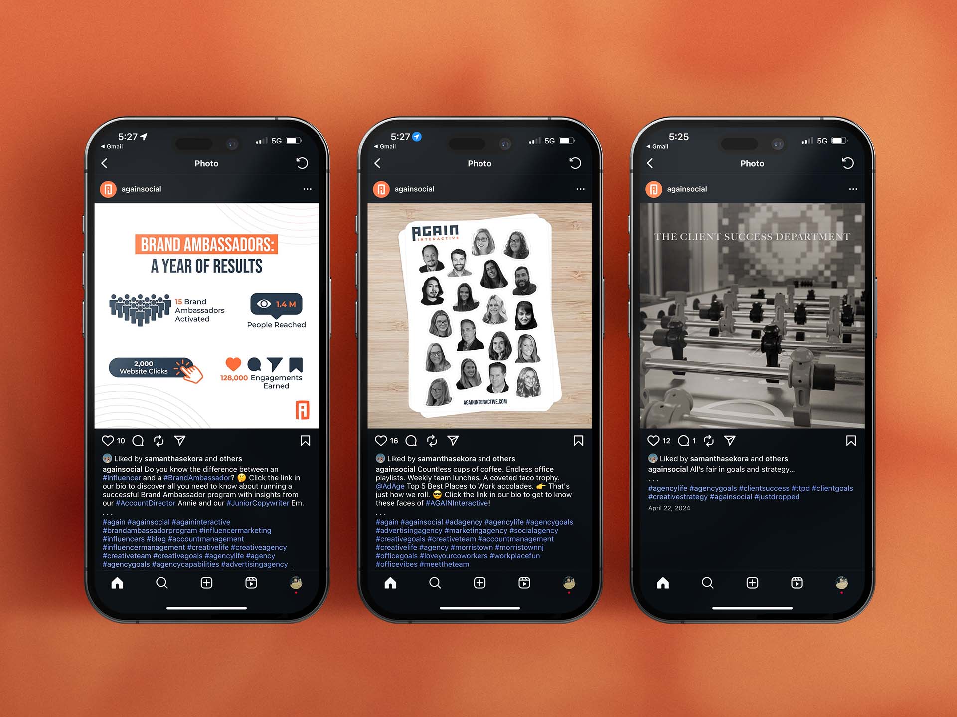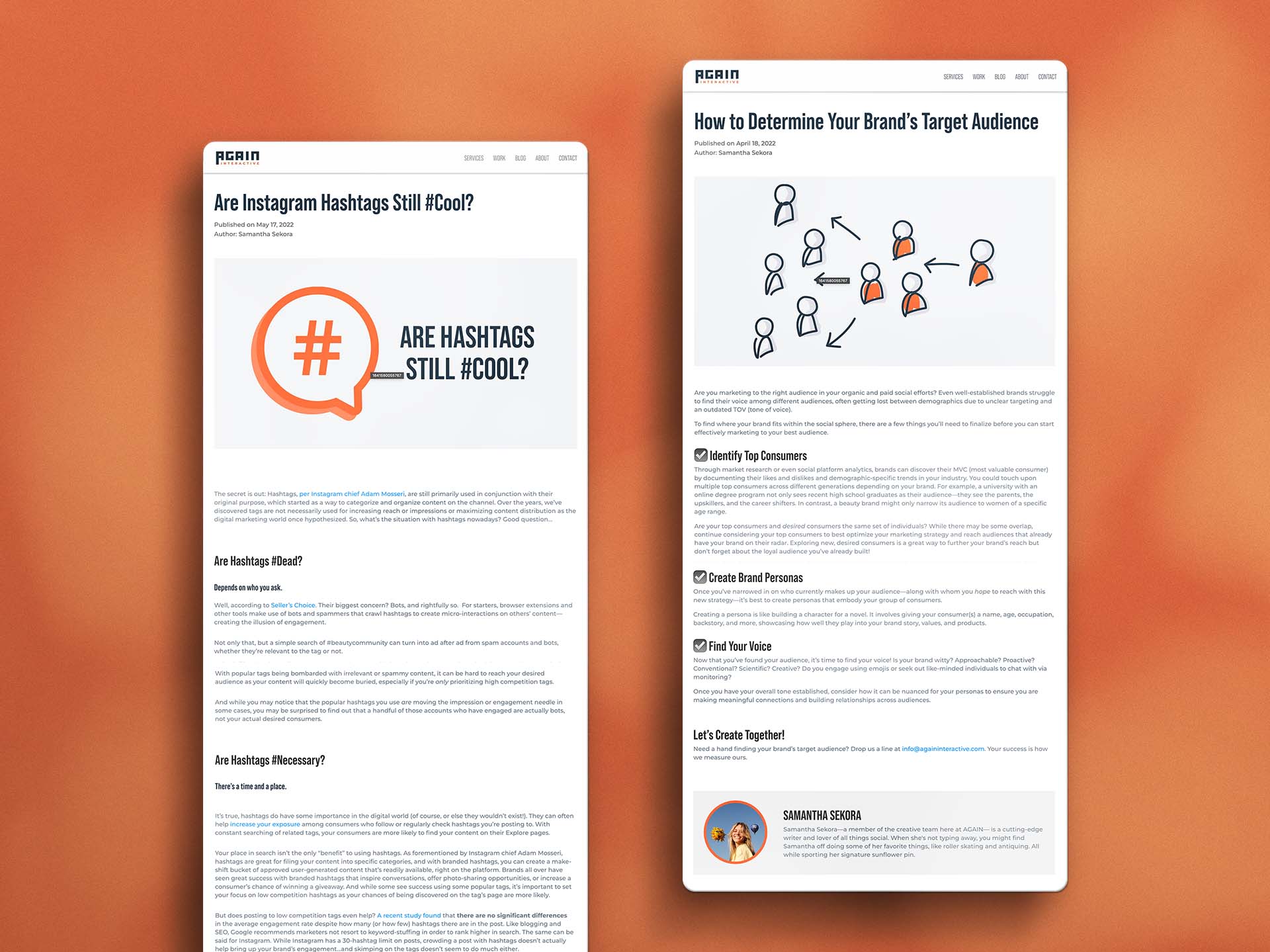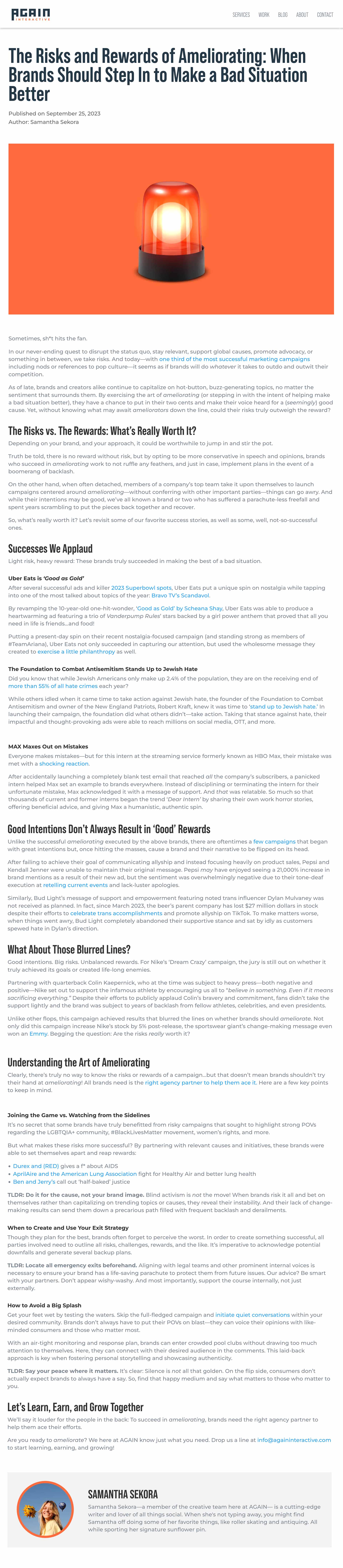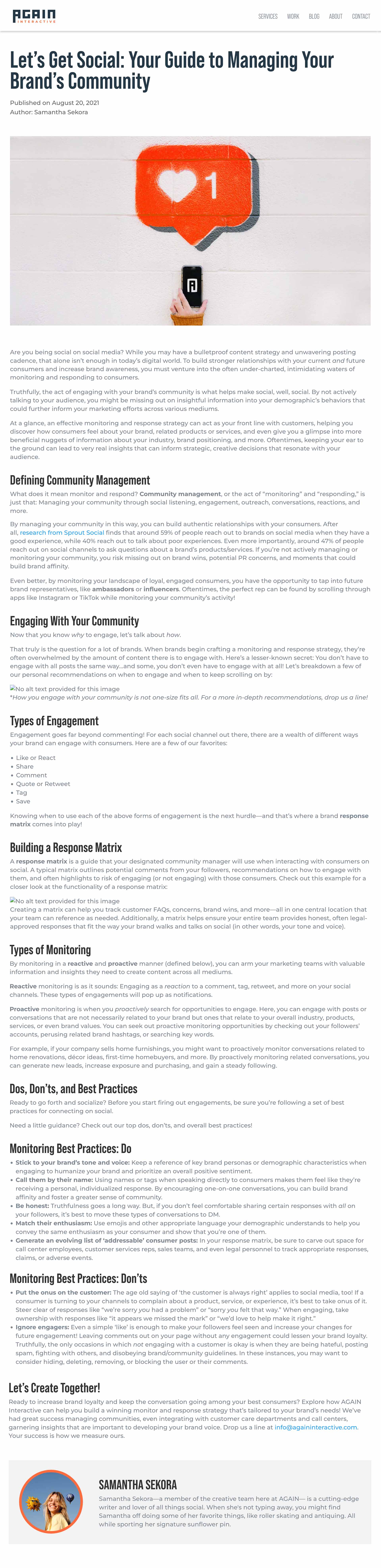 During my time at AGAIN, I improved storytelling through creative copywriting across our client portfolio, led internal and external strategic planning efforts, authored thought-leadership blog content on behalf of the agency and its team, and fostered an unparalleled company culture through event planning, client gifting, employee advocacy/recognition efforts, and agency social media management.