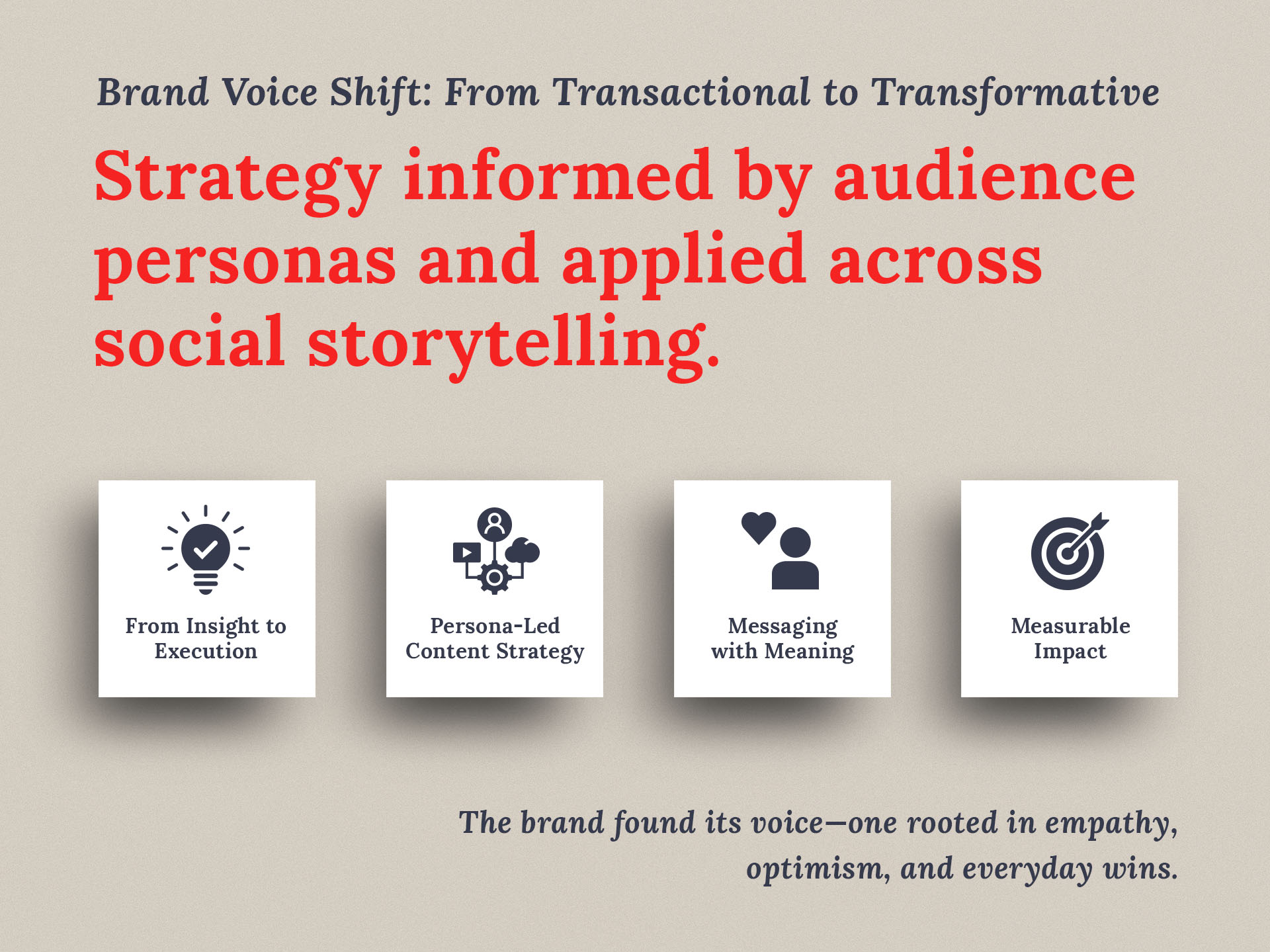 I strategized a new set of tone of voice guidelines to revamp brand sentiment and shift storytelling across channels from "transactional" (sales-y) to "transformative" (emotion-evoking). To implement this move, I crafted monthly social media content and managed community conversations to increase interactions and deter negativity.